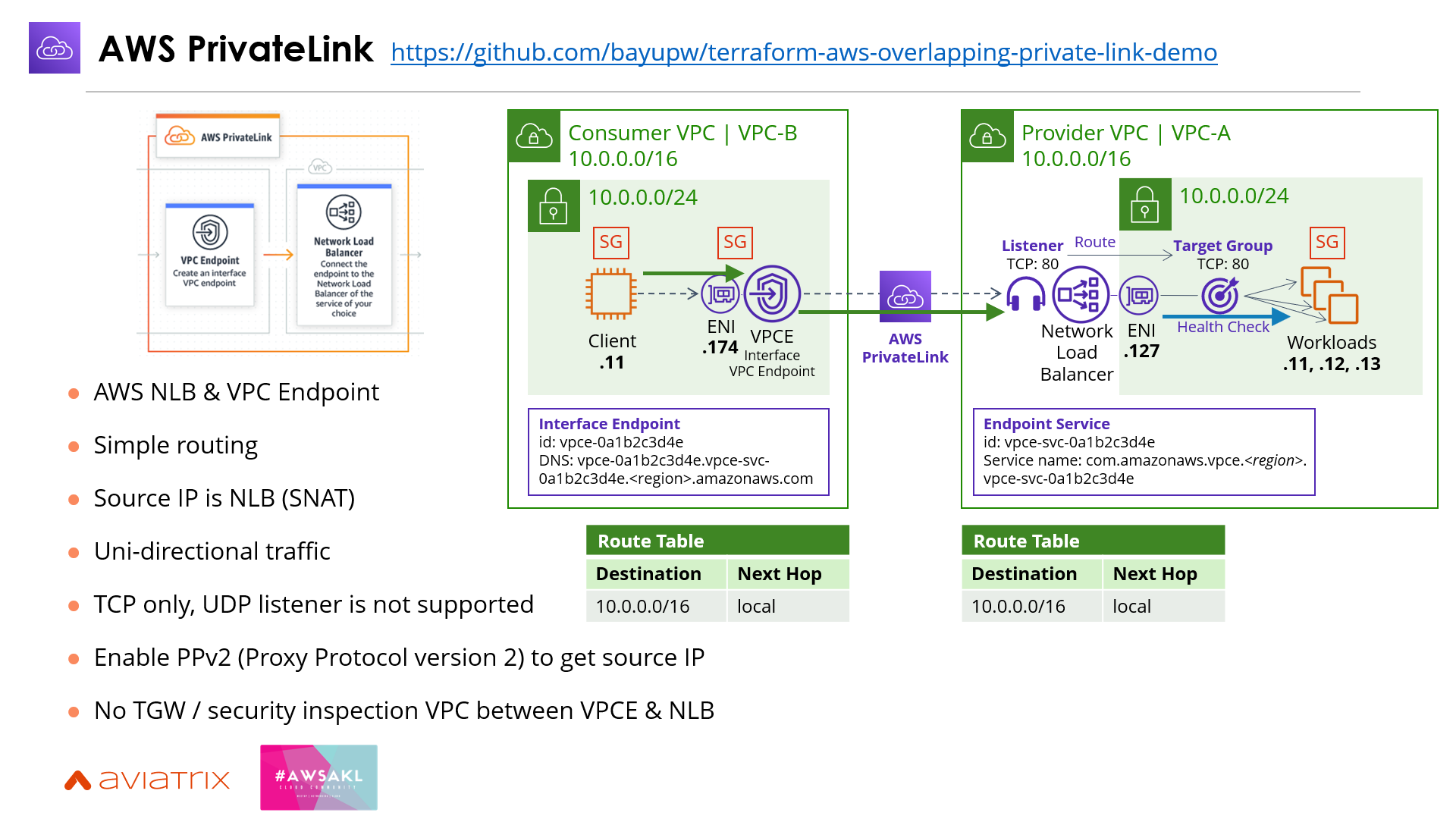 Here’s a sample terraform code that creates VPCs with overlapping IPs and connects them using Private Link: https://github.com/bayupw/terraform-aws-overlapping-private-link-demo