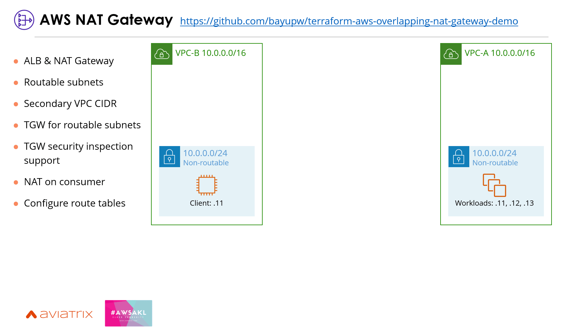 Here’s a sample terraform code to deploy the solution: https://github.com/bayupw/terraform-aviatrix-aws-overlapping-demo