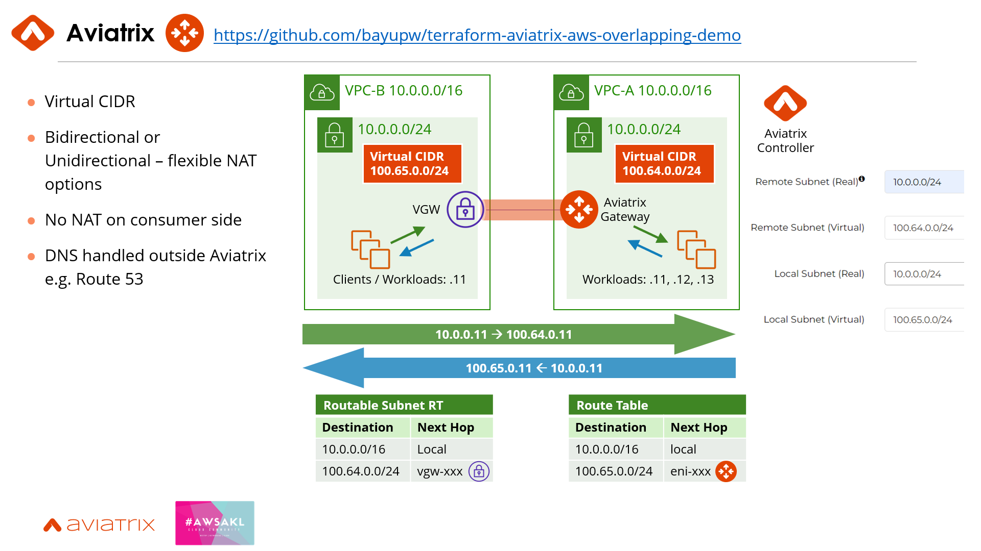 Besides solving overlapping IP issues, Aviatrix also provides additional features that organizations often need in an overlapping IP scenario, like the option for bi-directional traffic, policy-based segmentation, traffic inspection via Next-Generation Firewall and visibility of traffic flow regardless of the cloud provider. There was an Aviatrix TechTalk session which covered this overlapping scenario in a SaaS provider scenario with a nice demo.